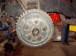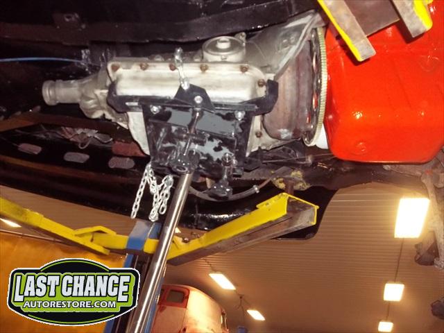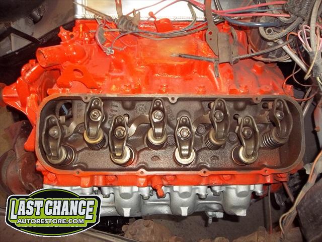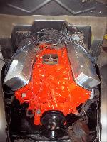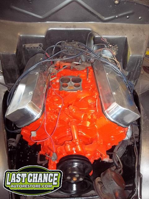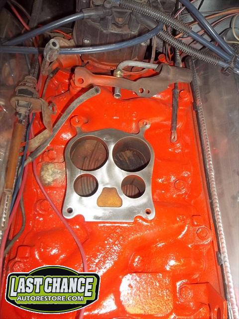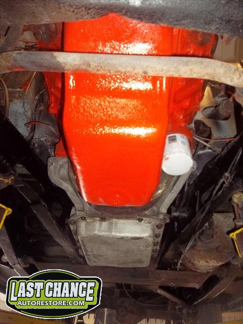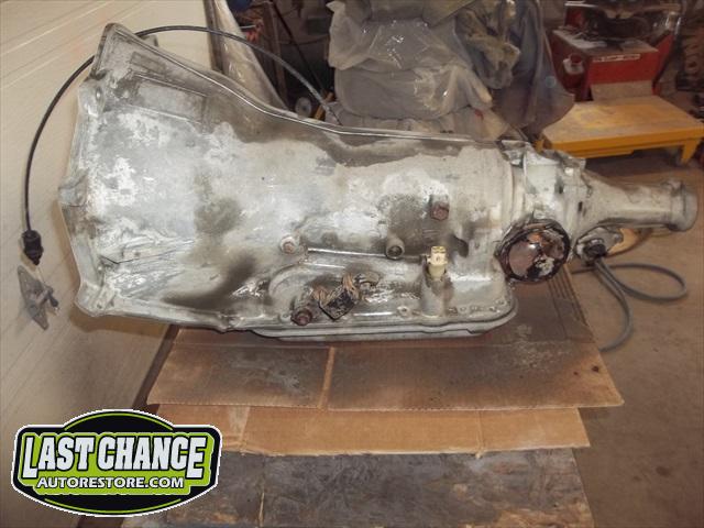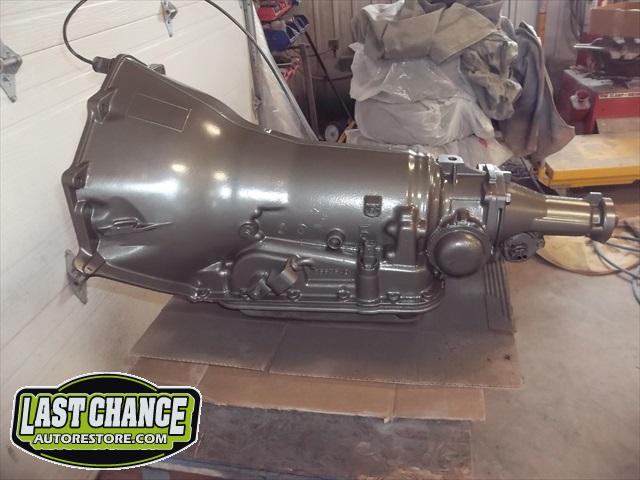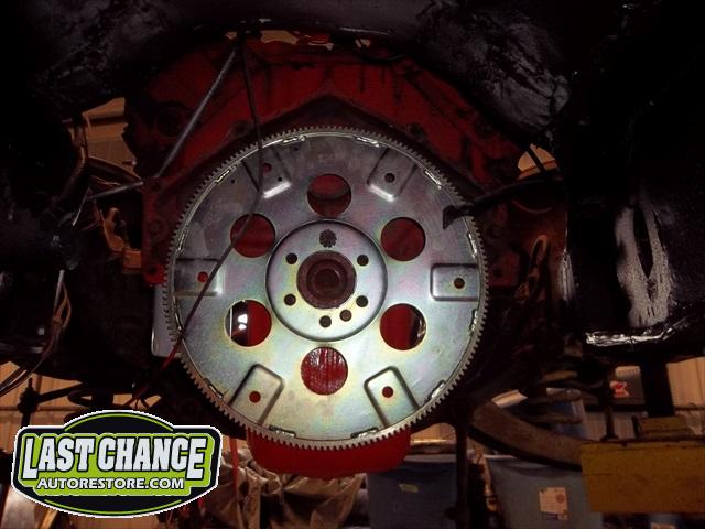 A new flywheel and starter were installed first. The engine tested out fine. The carb was removed (later replaced with a new one), the engine was cleaned up and painted. The Turbo 350 3 speed automatic transmission was replaced with an upgraded rebuilt 700R4 4 speed automatic.