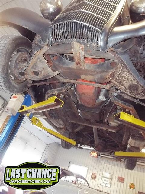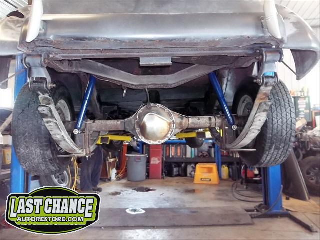 The front end is out of a 1970 Pontiac GTO (just drum brakes) along with a 1970 Chevy Camaro 12 bolt rear end assembly and leaf spring suspension. The previous owner improperly cut the front coil springs and installed unknown leaf springs without rear shocks.