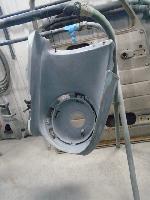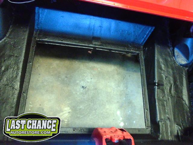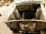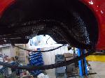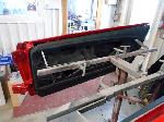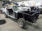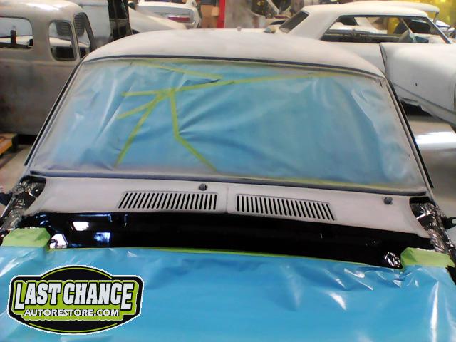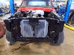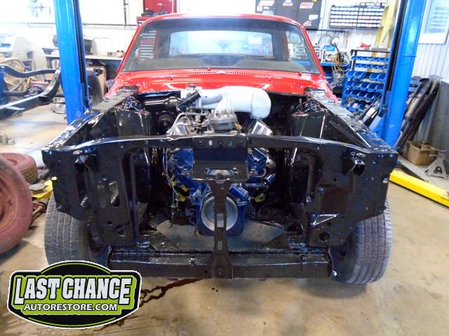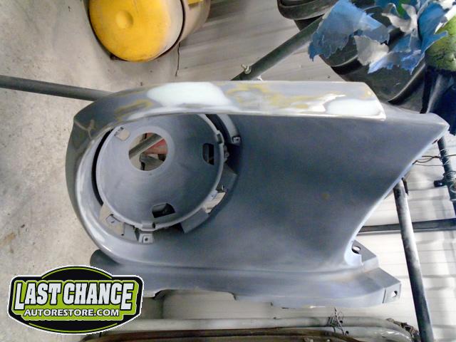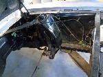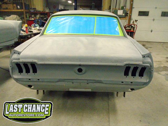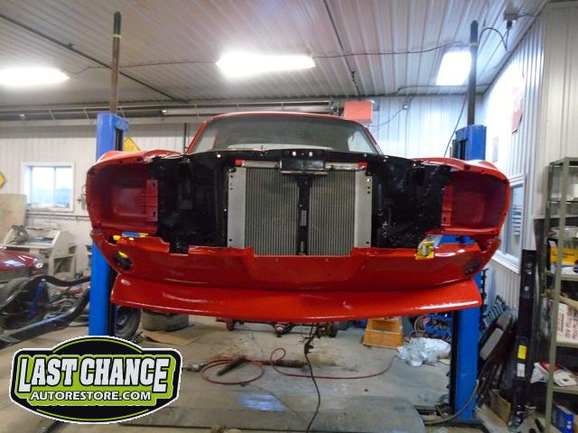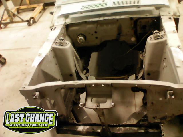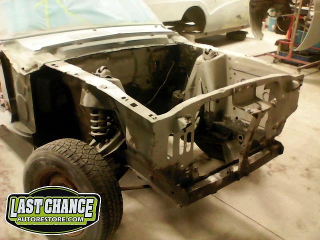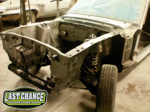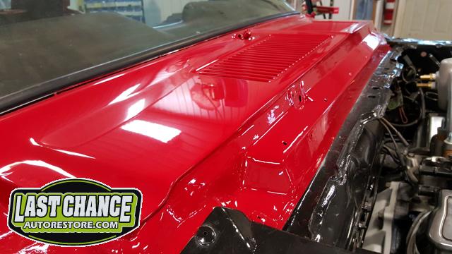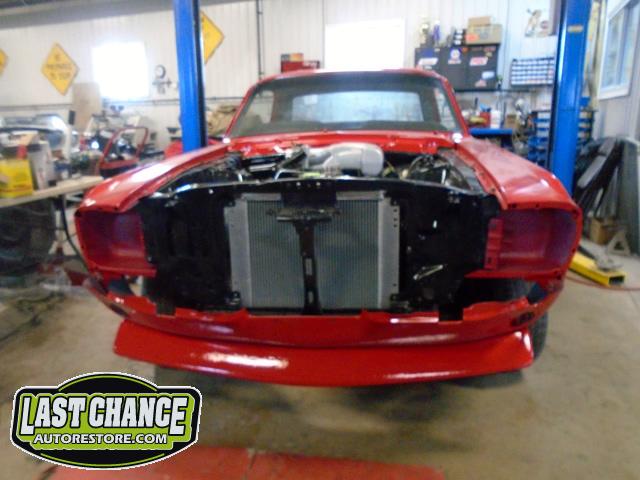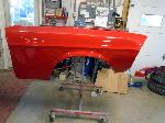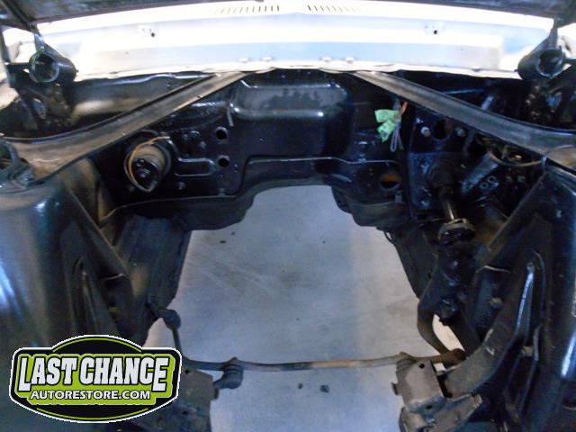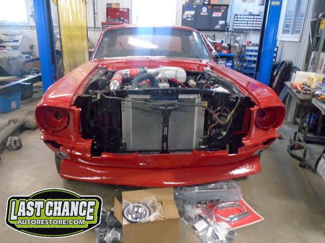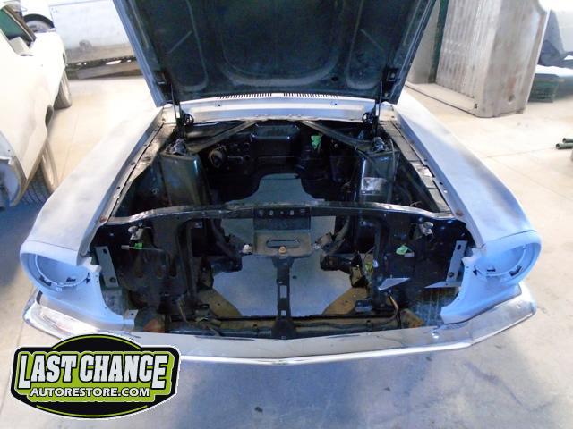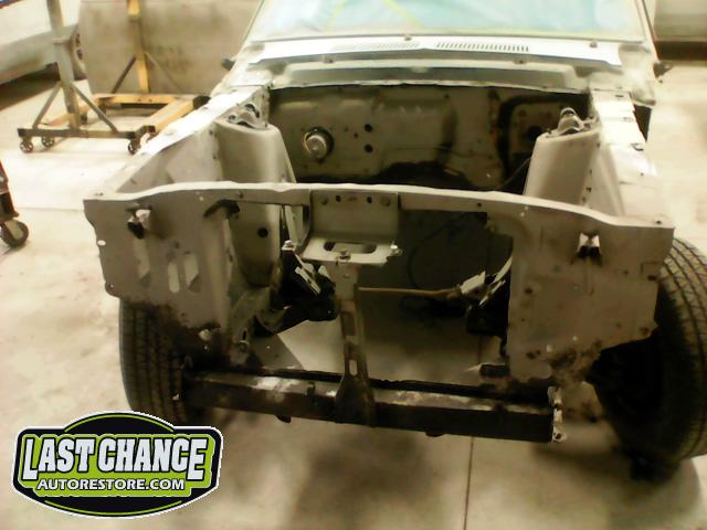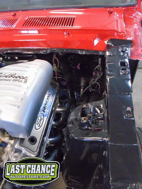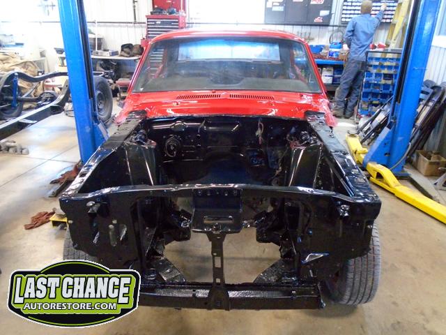 The front end section of the Mustang was repaired, degreased and media blasted. The complete front clip received three coats of high gloss black two part epoxy.
