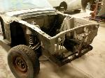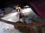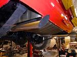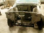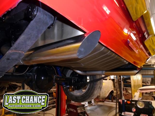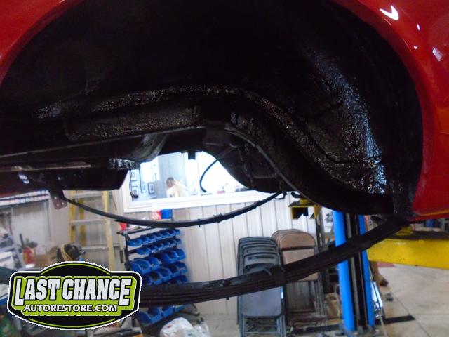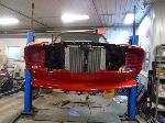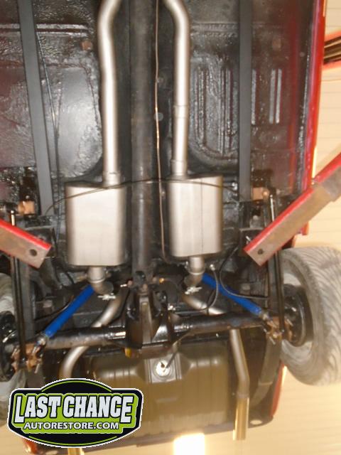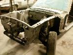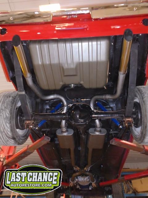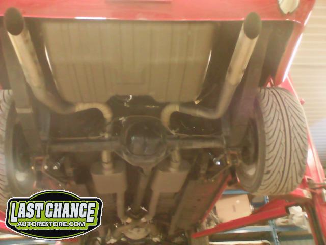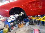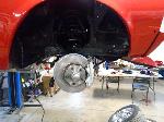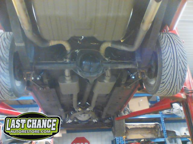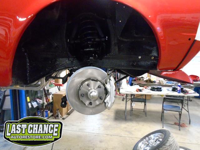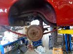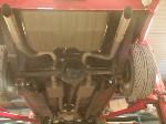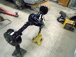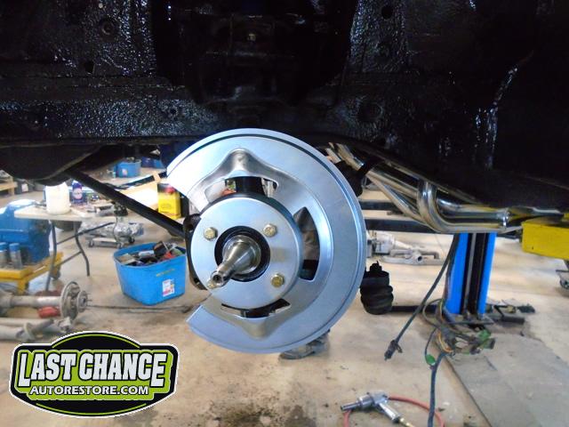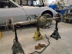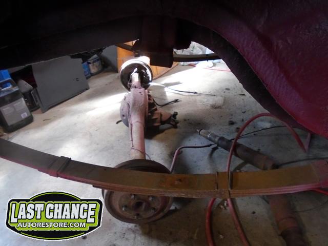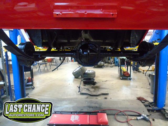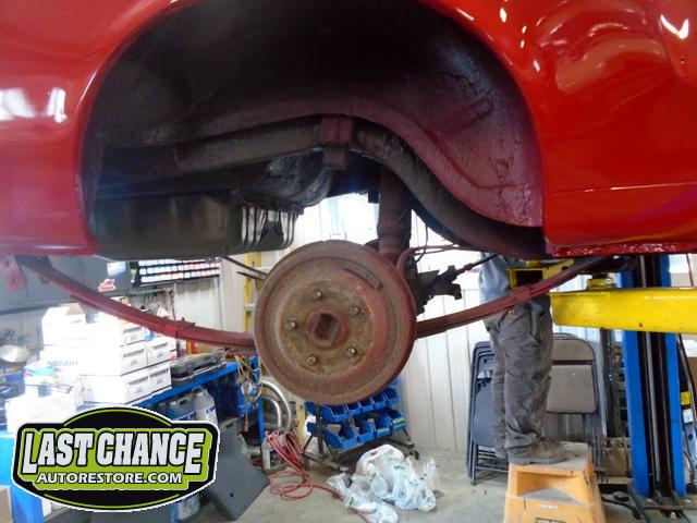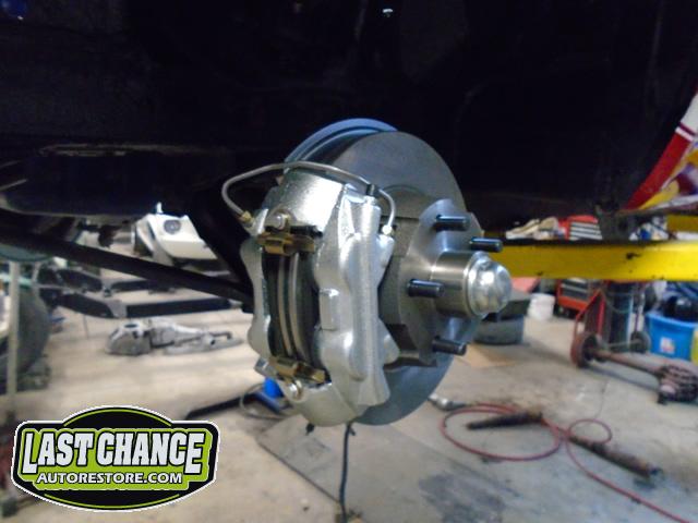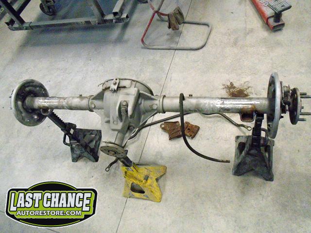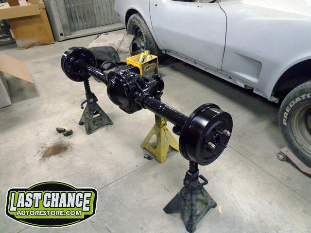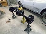 The old drum brakes were removed, the new complete Power Front Disc Brake Conversion Kit was installed, the original old rear end assembly was removed, the replacement rear end assembly was set into place.