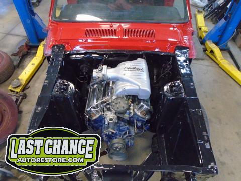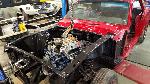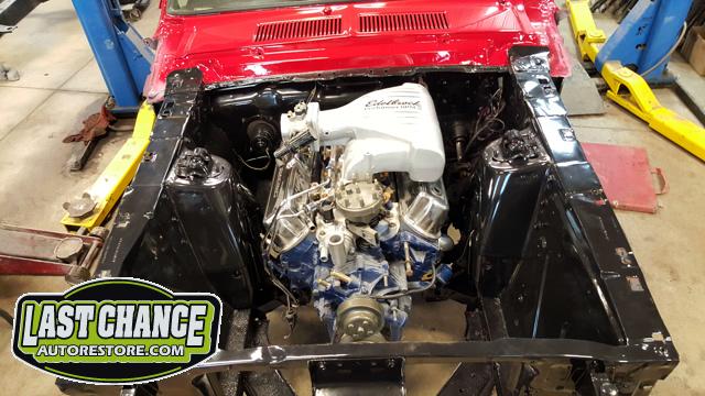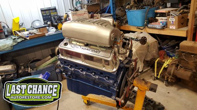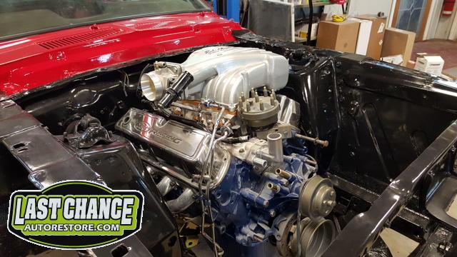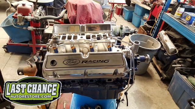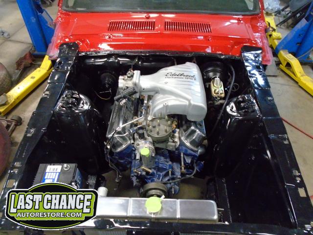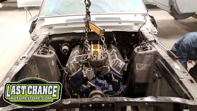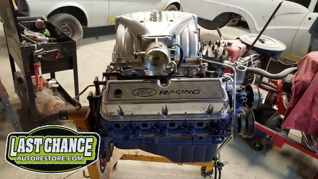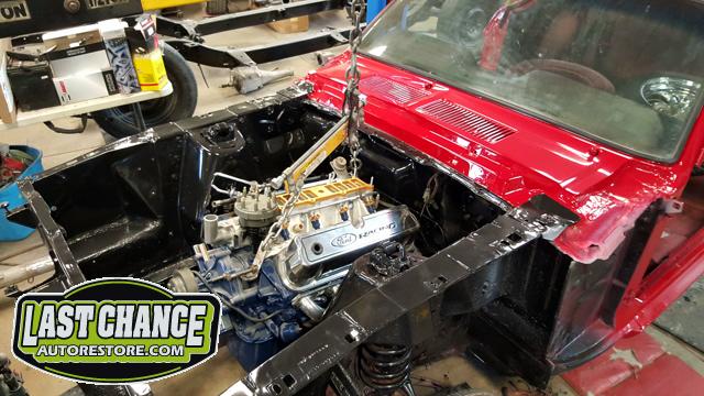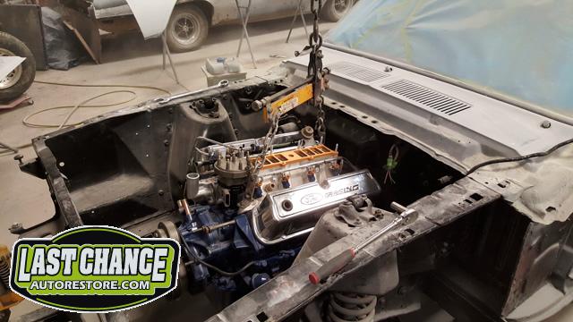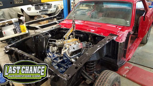 Our "new" motor and transmission was dry fitted into the Mustang engine bay and everything bolted up as we wanted. We pulled the motor and transmission back out and continued on with the body work.