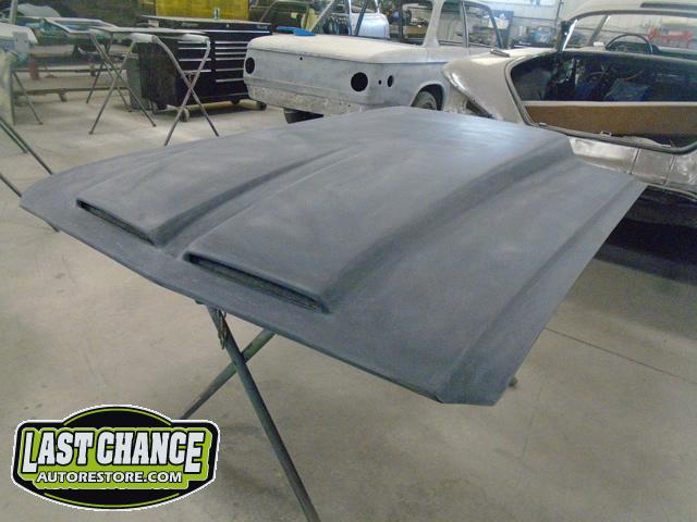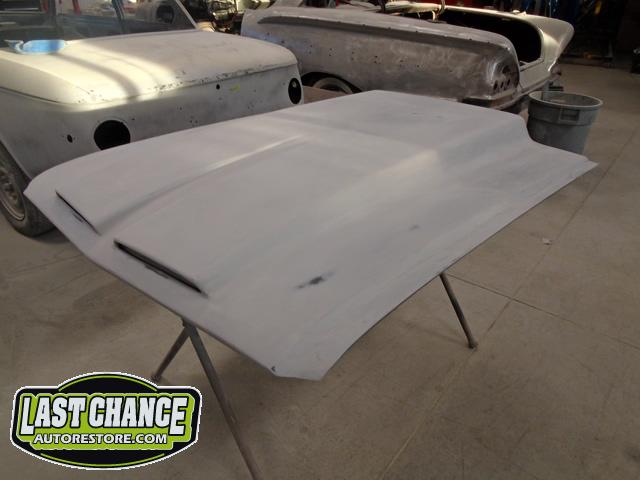 This Custom Mustang is getting a "One of One" Custom Made hood with dual scoops! It has a 4 Inch lift (we require extra height because of the upgraded Edelbrock intake). It was dry fitted to ensure fit and removed to continue with the re assembly.