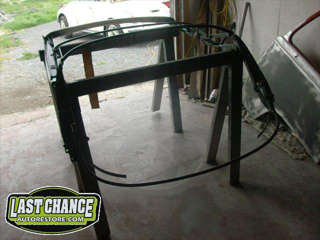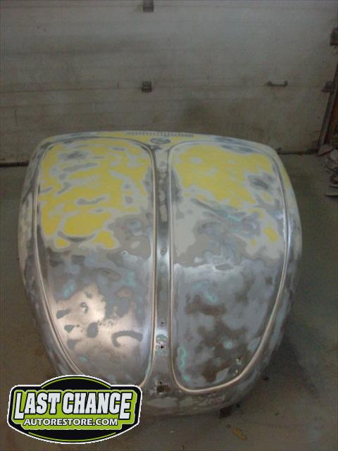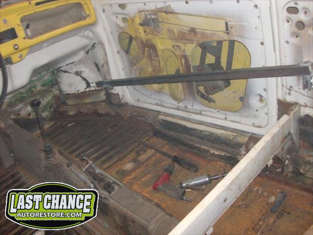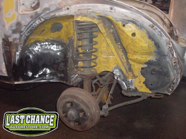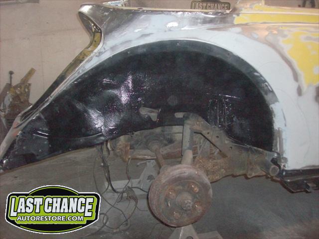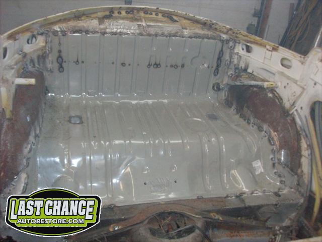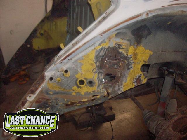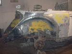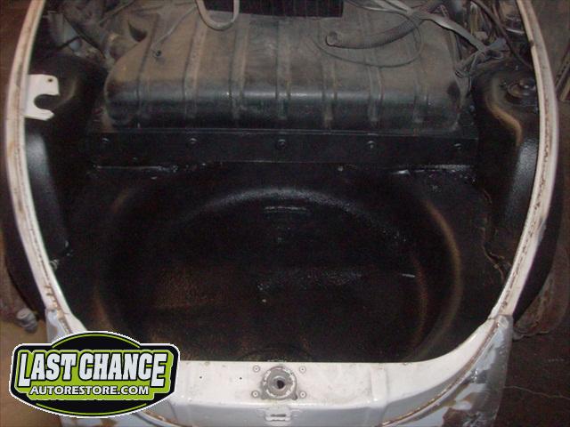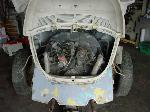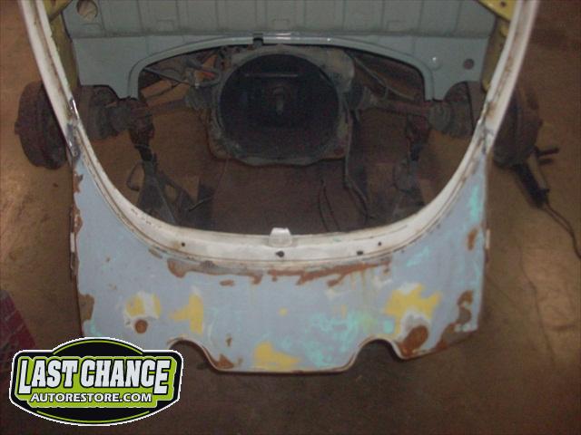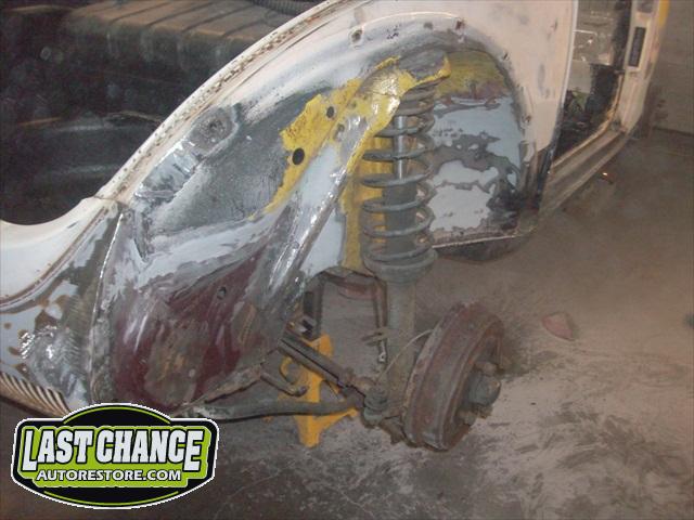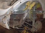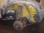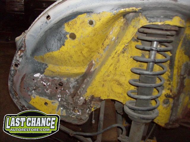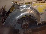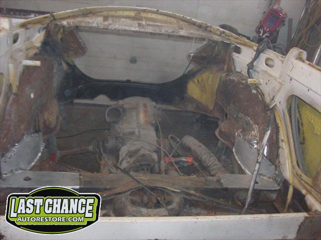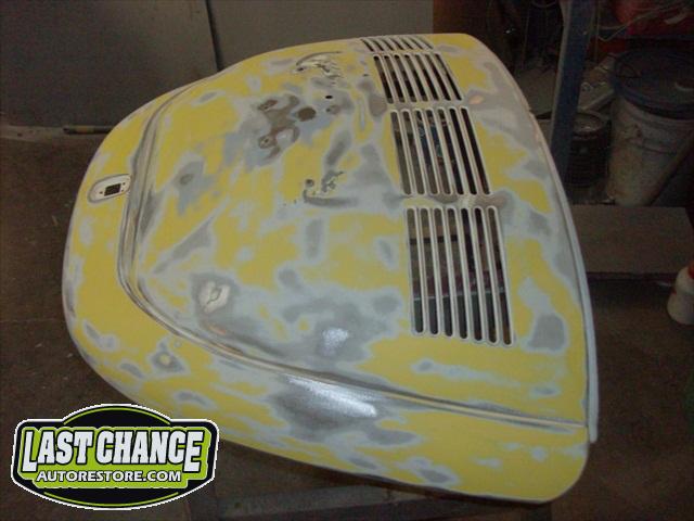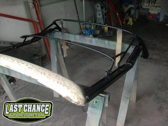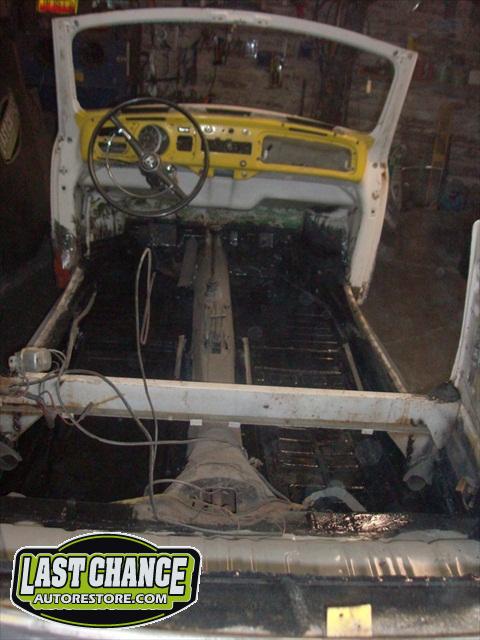 We removed the engine, along with the bumpers, lights, fenders and interior to expose the amount of work that will be required to restore her to original condition. The original colour combination was Lemon Yellow, with a black top and black interior.