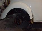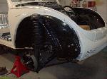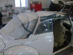 After the bodywork was completed, we painted Martha "Wimbledon White", and she looks great! We ordered new beige door panels, beige "basket weave" seat material, and a custom cloth beige convertible top along with a new high quality black carpet. We replaced all the brakes, brake lines and replaced the brake master cylinder. We sandblasted and painted a set of custom "A.T.S" "Period Correct" Alloy wheels, and installed brand new Goodyear Eagle "LS2" Tires.