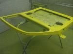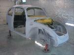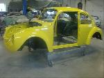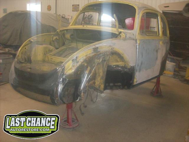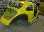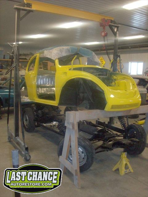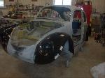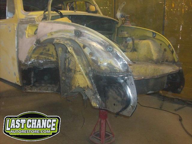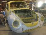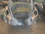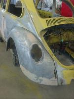 Sunny's body received cross bracing before the rusted out heater channels were removed (the heater channels are the main structural sections of a Beetle body). There was an extensive amount of cutting, grinding and measuring and prepping of rusted out sections before new panels were welded into place. We "dry fitted" all panels to be certain of proper fit before they were welded into place. (All 4 fenders were also dry fitted to be certain all new sections fit together correctly).