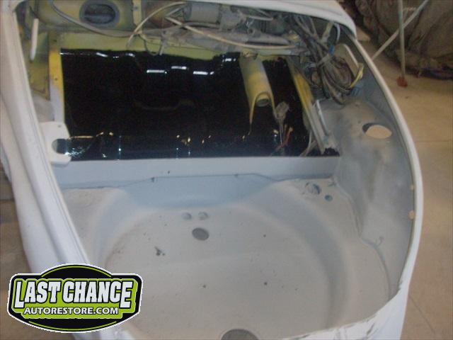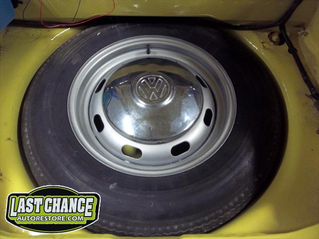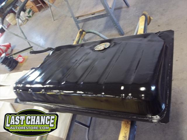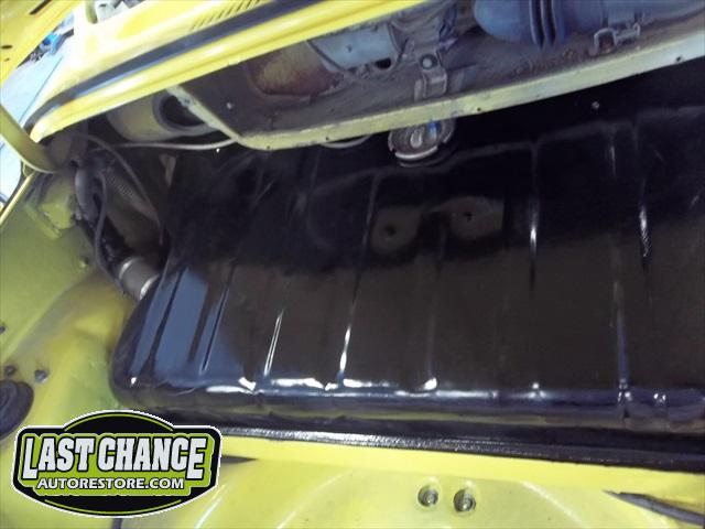 The spare tire rim was sandblasted and repainted. The gas tank (with new fuel lines and grommets) was installed and the front trunk/under hood area was treated to a special two piece carpet kit!