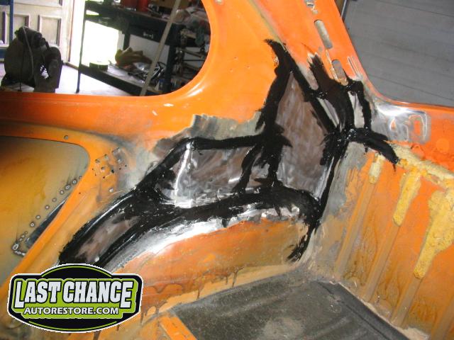 We removed the body from the chassis, and performed a large amount of fabrication. We repaired the floor pans, and welded new panels in the areas needed on the body.