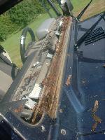 The windshield frame was completely rotted along the bottom and was allowing wind and rain to come in to the cabin. The windshield was also cracked and needed replacement.