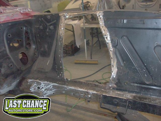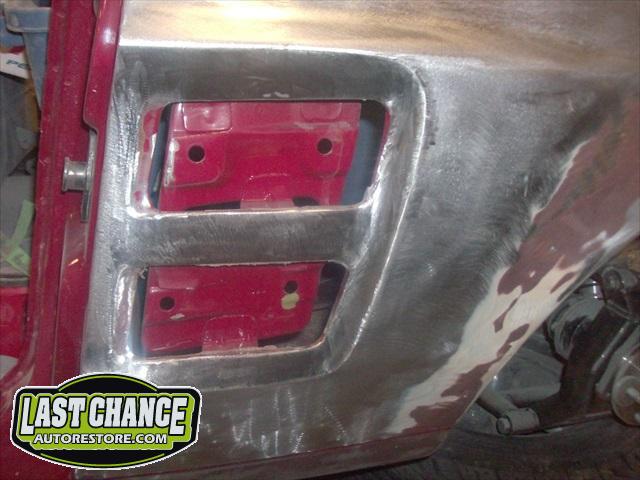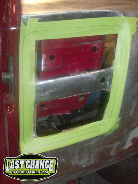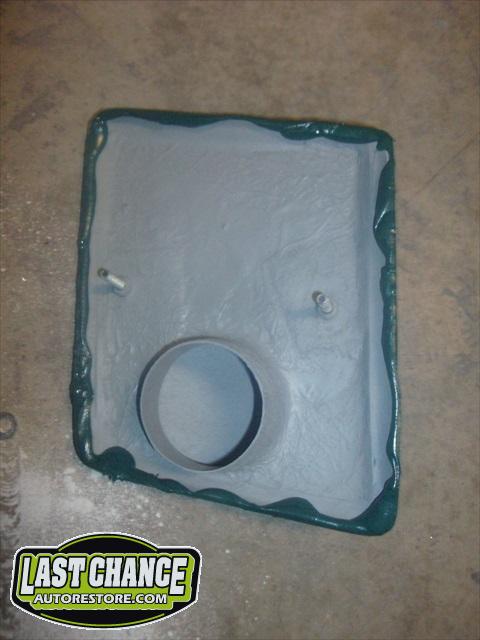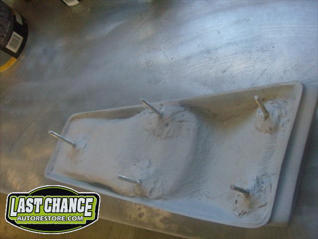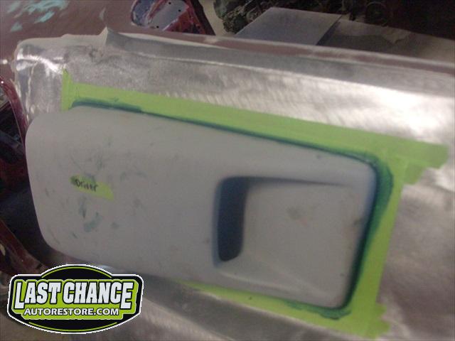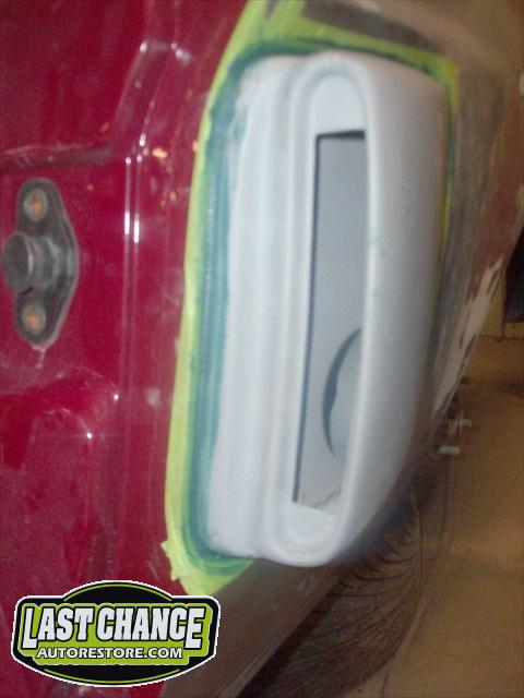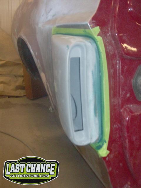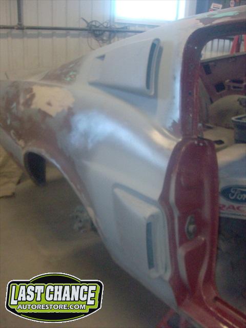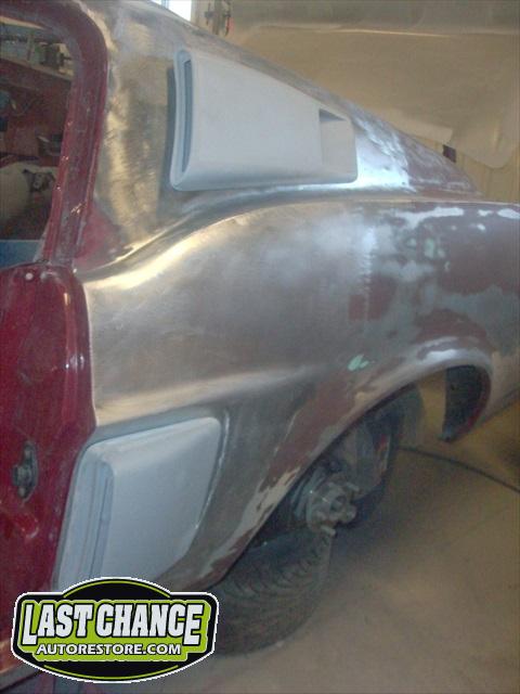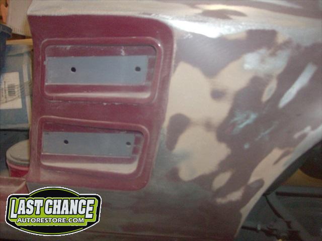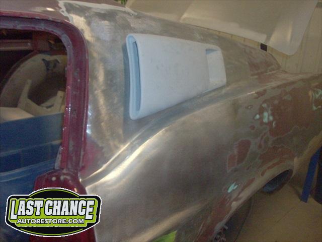 The body upgrades have begun. The 4 Shelby side scoops (two per side) were dry fitted, body smoother was added where needed (to ensure a proper snug fit to the body panels). Once the scoops fit perfectly to the panels, the surrounding area of the quarter panel was sanded to bare metal and a special etch primer was applied to properly seal the bare metal and prepare it for upcoming primer.
