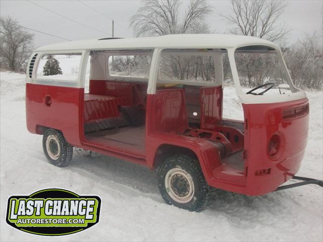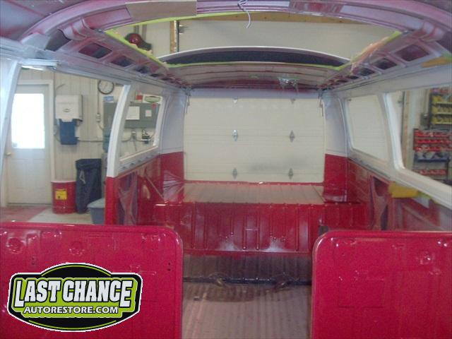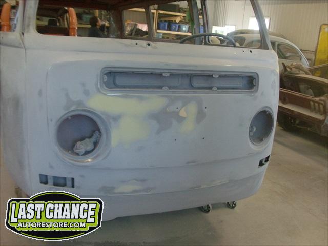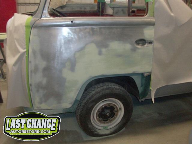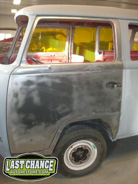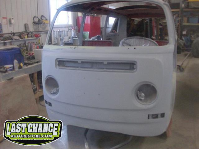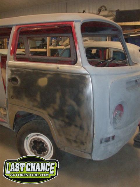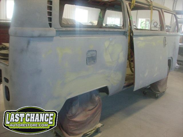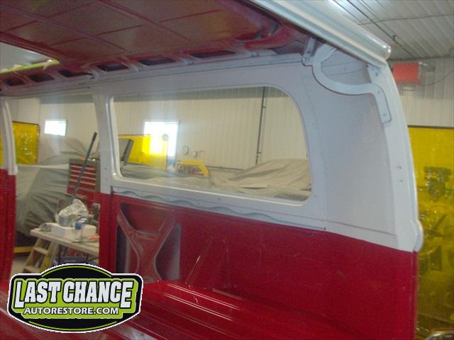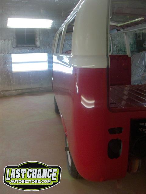Nellie received her custom two tone paint job. We painted her with Premium Single Stage paint. Our client requested VW Authentic Cloud White (VW Code L581) and Montana Red (VW Code L30H) paint finish.