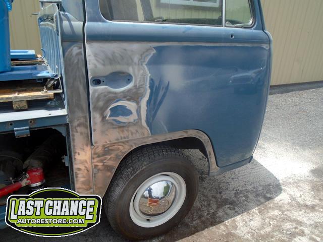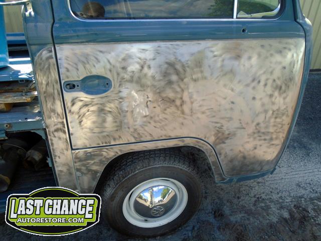 We will continue to sand the thick amounts of paint and body fillers to prepare this nice VW for its future steps on the road to restoration.