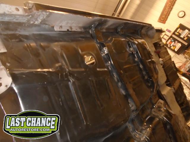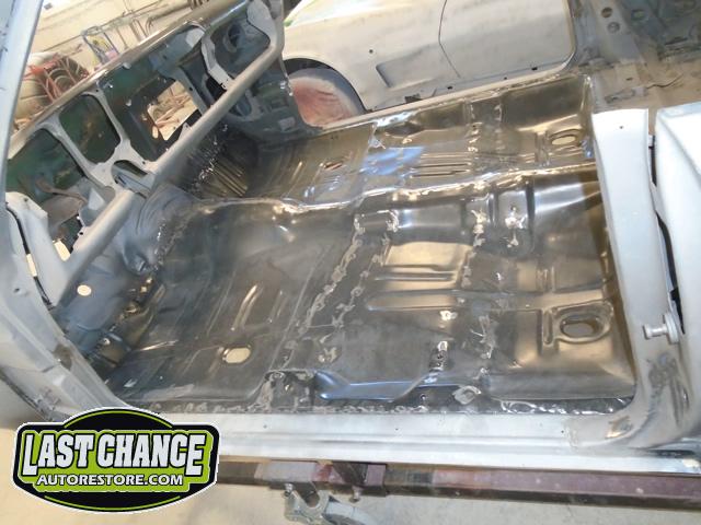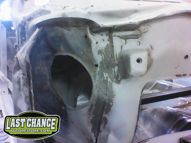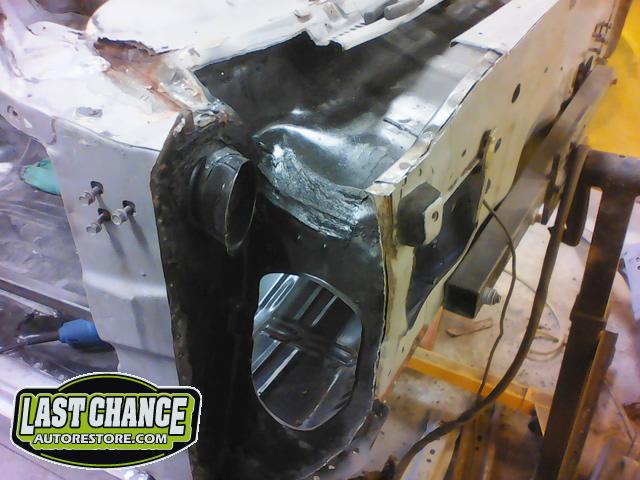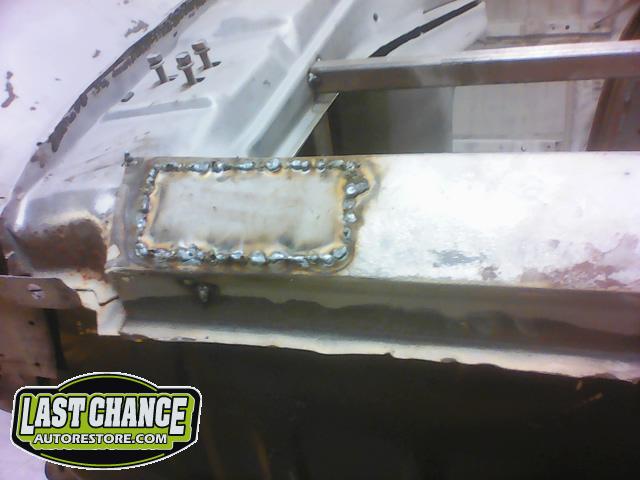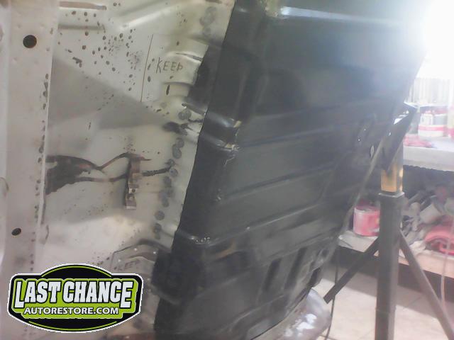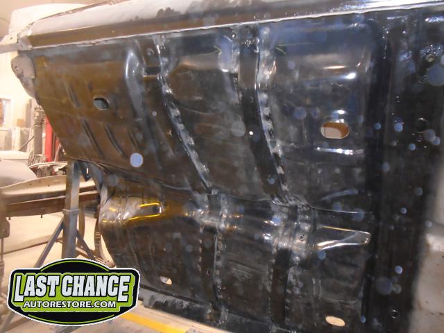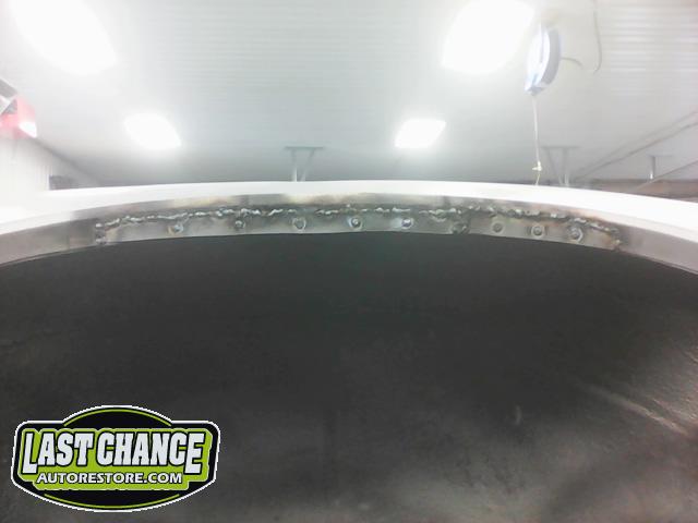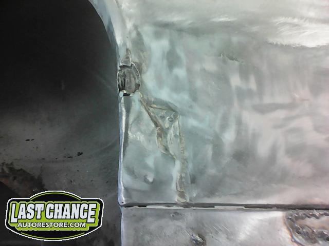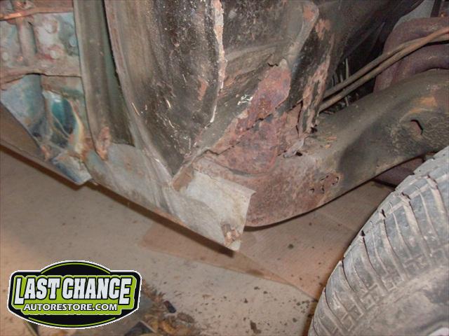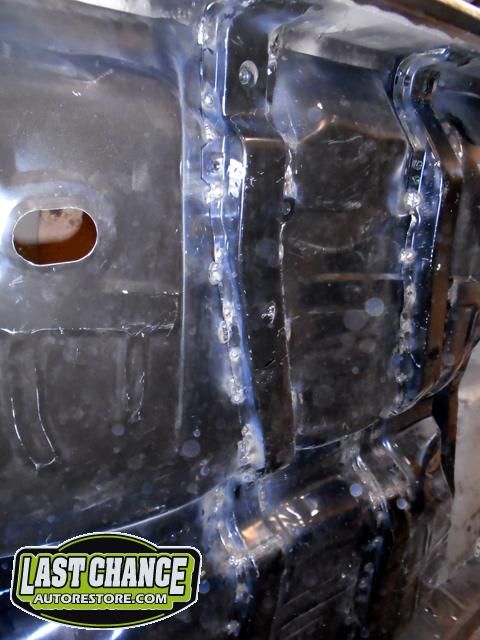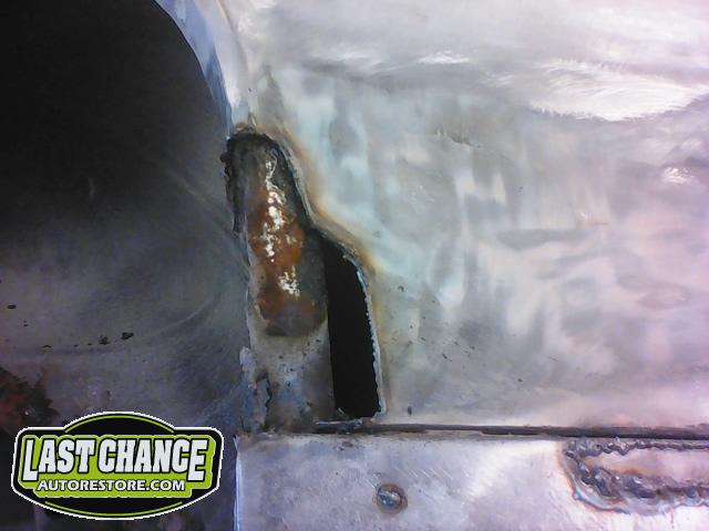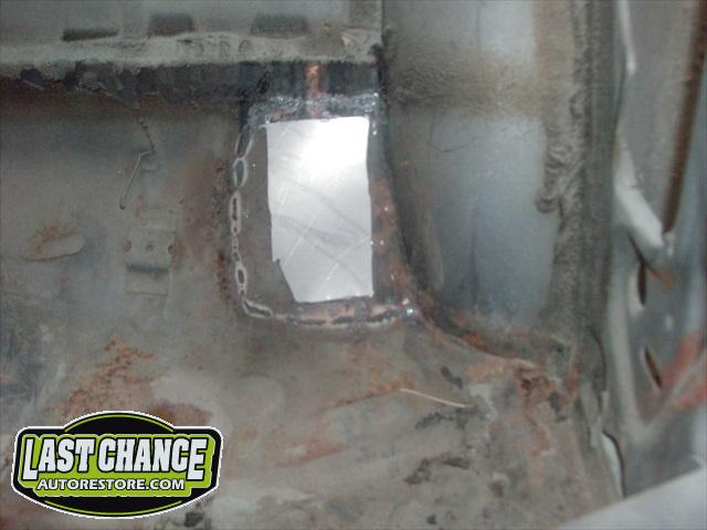 Several rusted sections in the inner and outer rocker panel areas were all cut out and replaced with new metal. The rear wheel wells were also treated to new steel where needed.