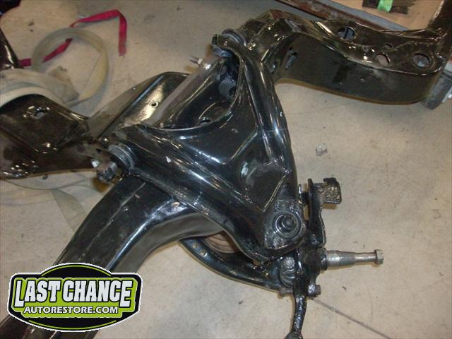 Our attention went back to the "New" frame. The front suspension, steering and brake components were taken apart, degreased and sandblasted. We applied two coats of special POR15 high gloss black paint to all of the components. New shocks, brakes, bearings and seals were installed, along with new brake rotors, brake pads and calipers.