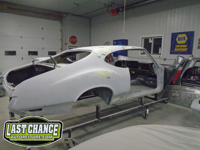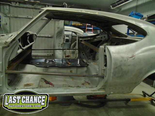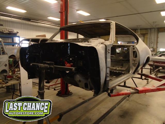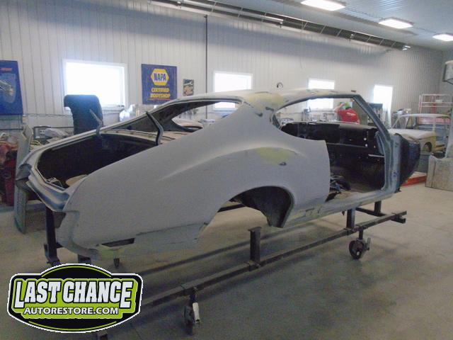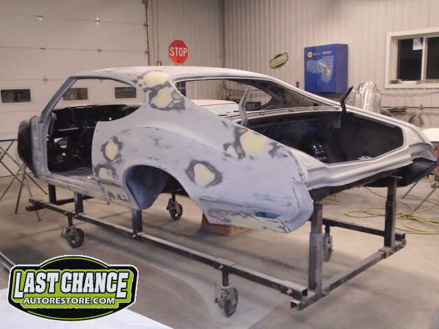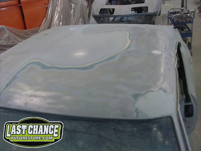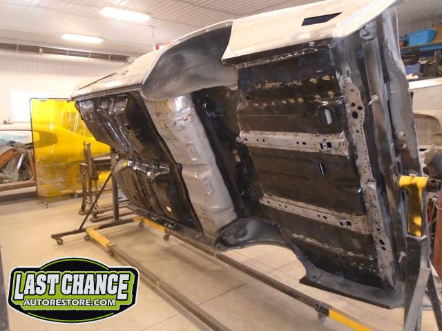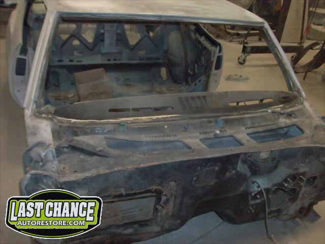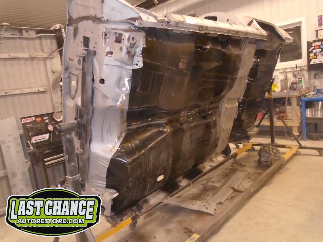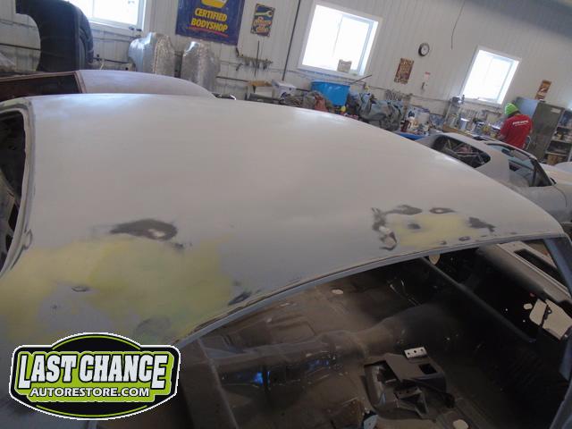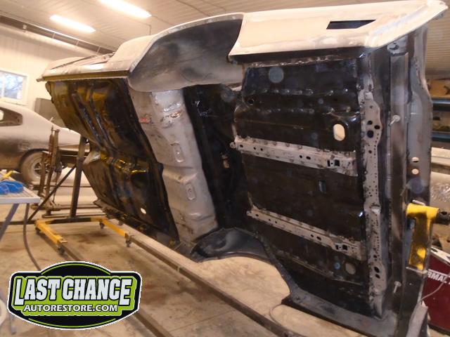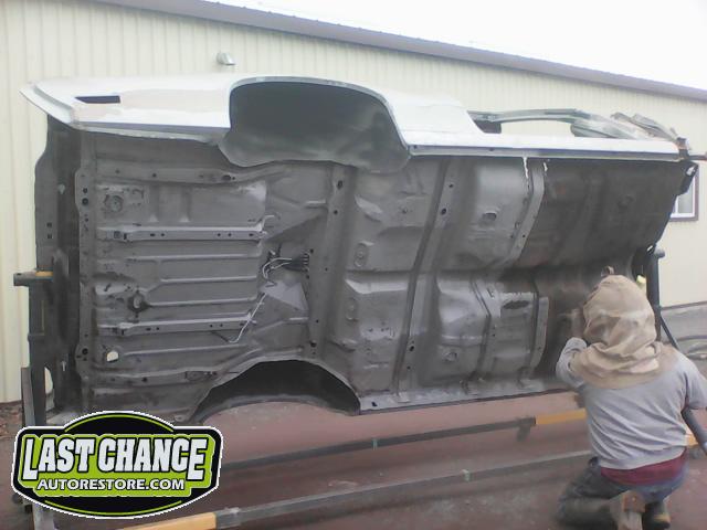 The replacement (Silver Body) was dis assembled. Several layers of paint and primer was sanded down to expose a very nice body shell. The replacement body was installed onto a custom built rotisserie.