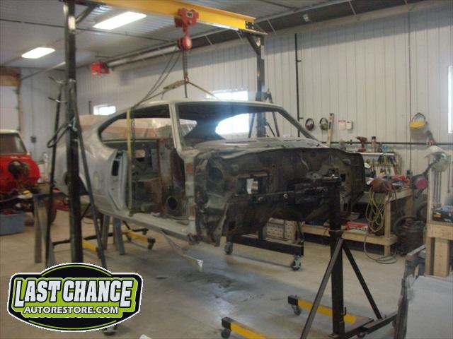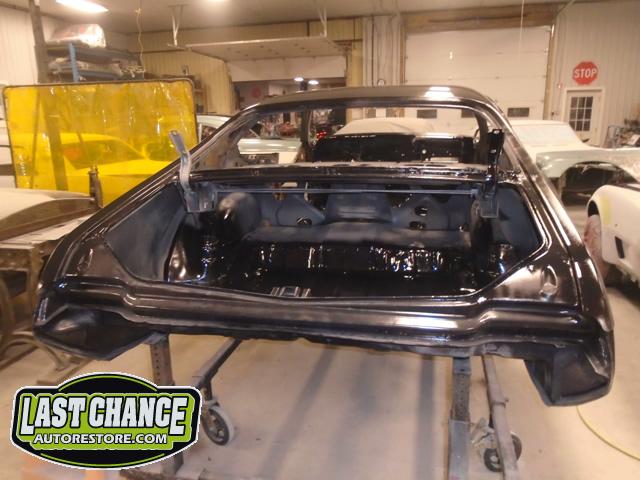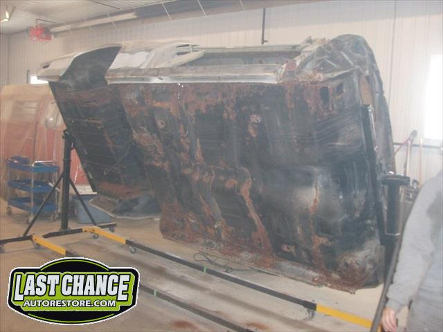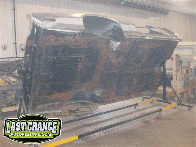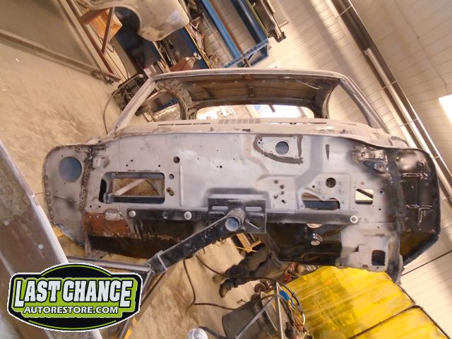 Our attention turned to the car body next. We removed the hood, fenders, bumpers, grille, radiator support, doors, all glass, the complete interior and dash was also removed. The driveline and exhaust was also removed. The body was removed from the original rotted out old frame and installed onto a rotisserie.