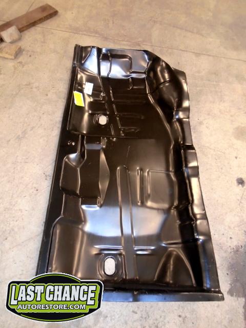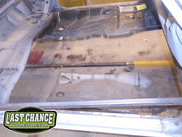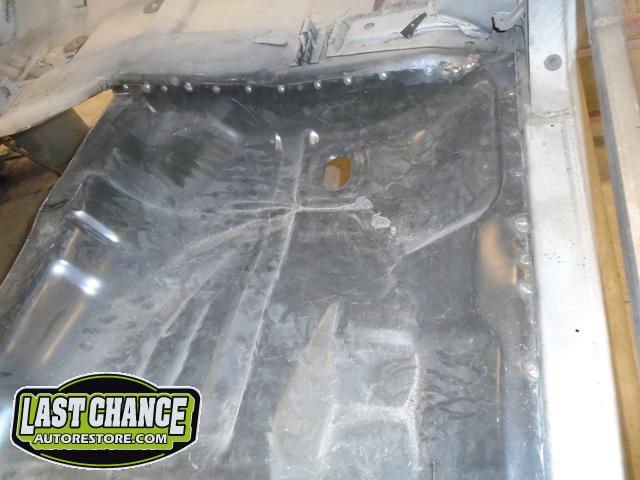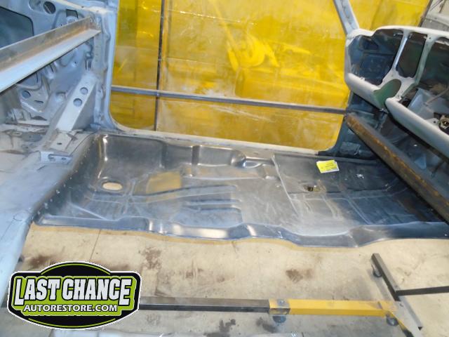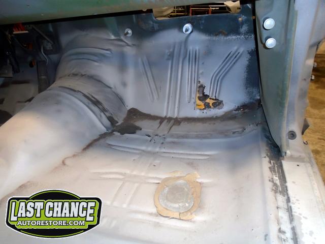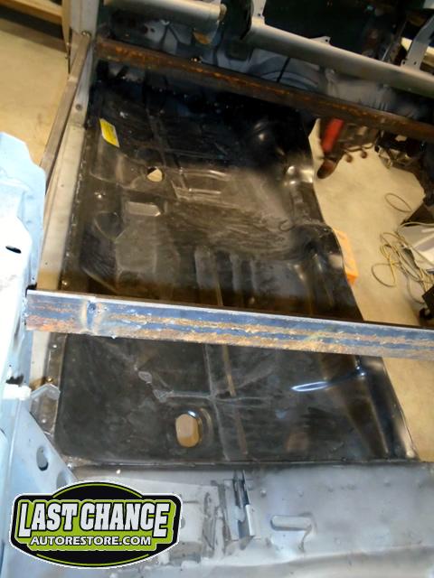 Factory correct (high quality) replacement floor pans, trunk pan and main support rails were ordered. The rusty old metal was cut away, new panels were dry fitted and welded into place.