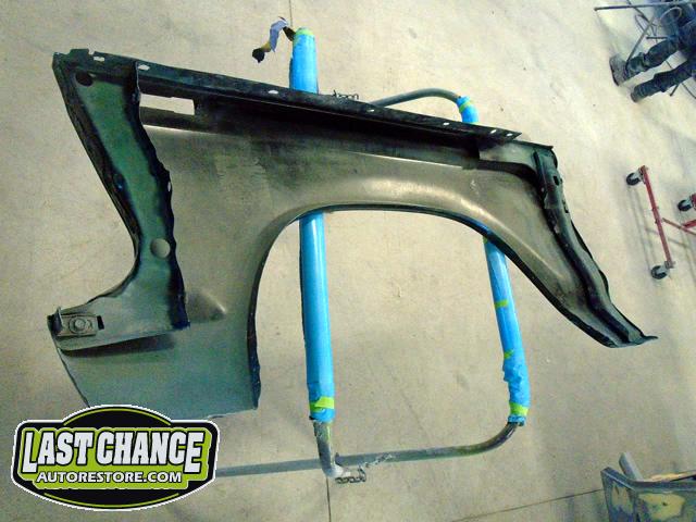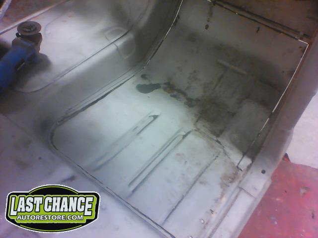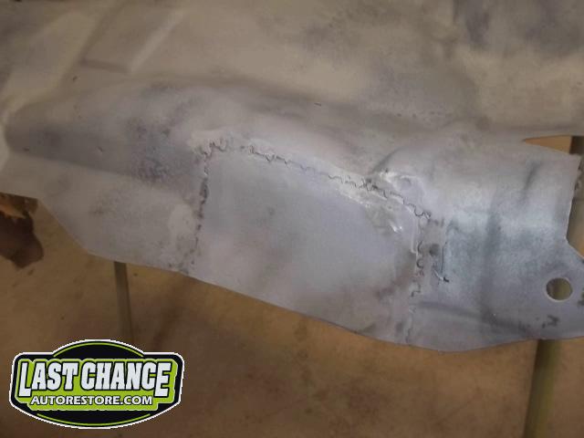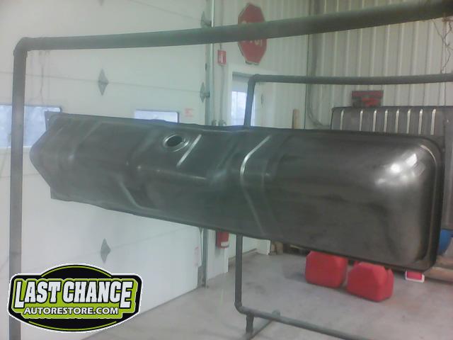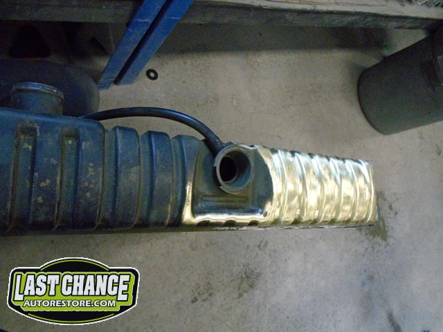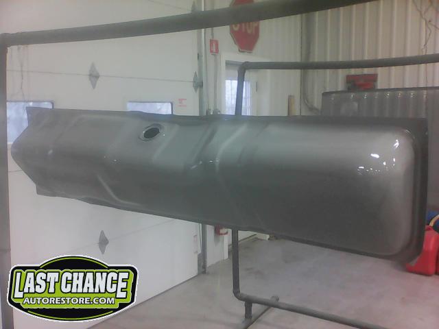 The rusted front/side mount fuel tank was discarded and replaced with a high quality brand new tank. The new fuel tank was degreased and cleaned before receiving a special two part epoxy grey coating along with a new sending unit and new tank straps.