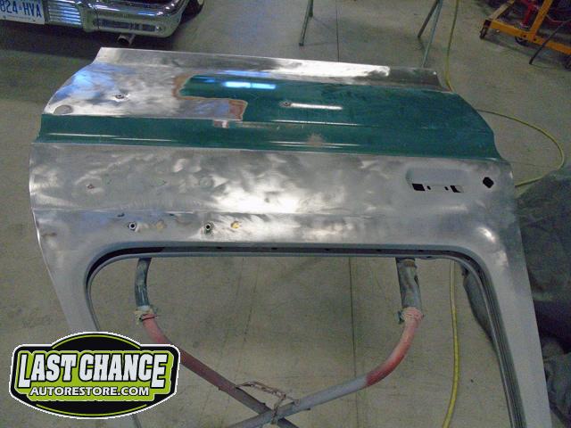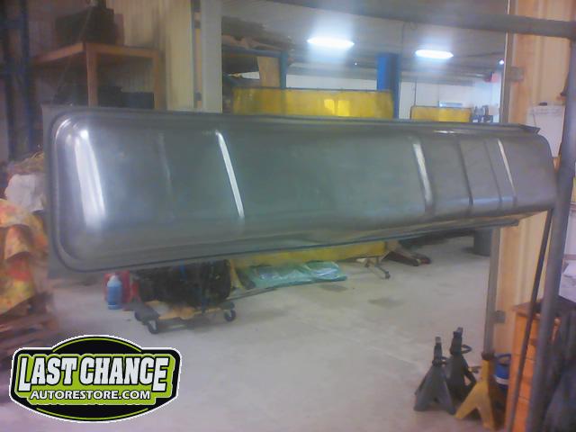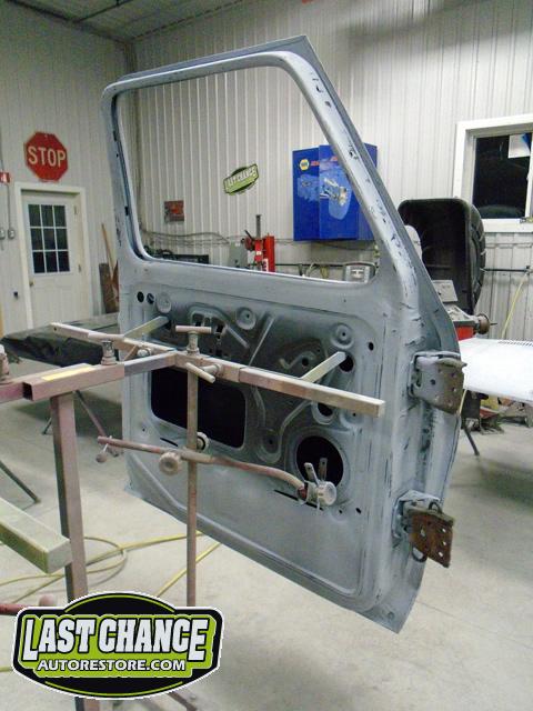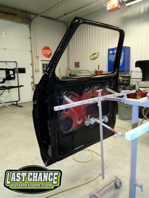 The re assembly continued. We installed the front windshield, rear sliding window, both doors, both front fenders and front hood hinges and hood were installed.