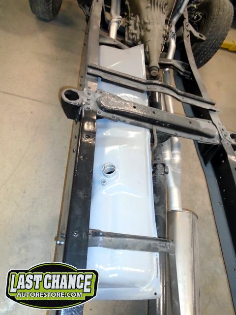 With the truck frame back on its temporary wheels and tires, we re installed the freshened motor and transmission along with a new exhaust system and installed the dual fuel tanks.