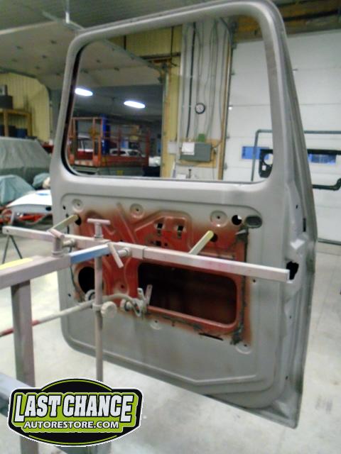 Our attention turned to the cab of the truck next. After the cab was media blasted rust areas were exposed. We cut out the rusted sections and welded in new high quality replacement panels where needed.