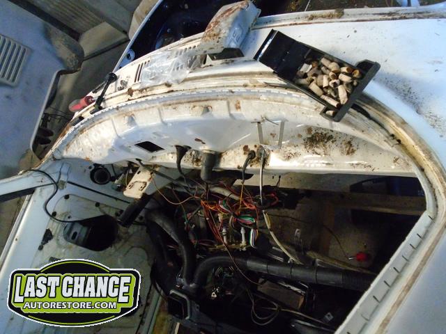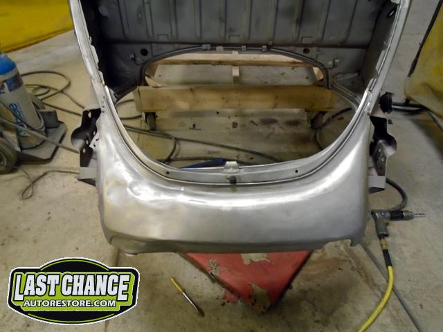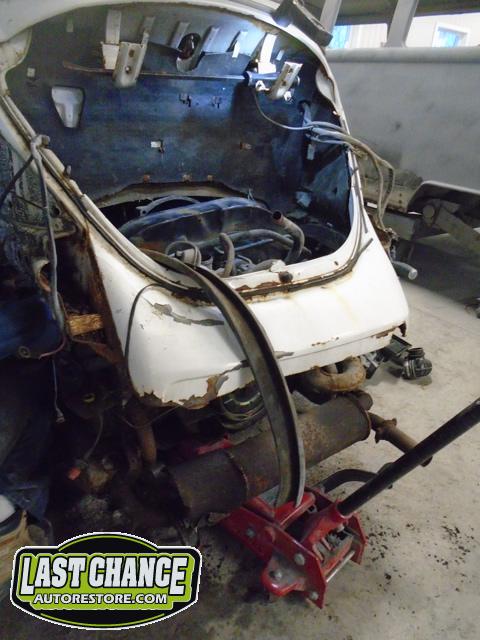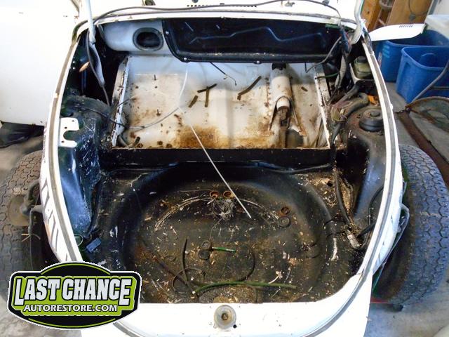 The front and rear bumper brackets along with front and rear fenders were removed first. The hood and engine lid next. All of the under front hood components were removed, the gas heater, spare tire, windshield washer lines and jug and gas tank.