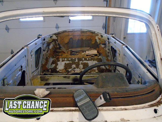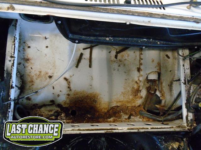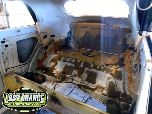 The front seats were removed (with their very rusty seat frames), and the rear seat cushion and back were removed next.