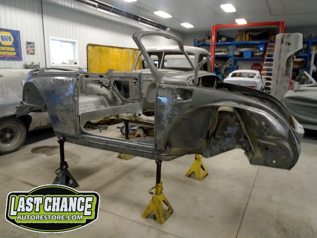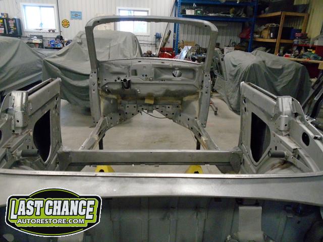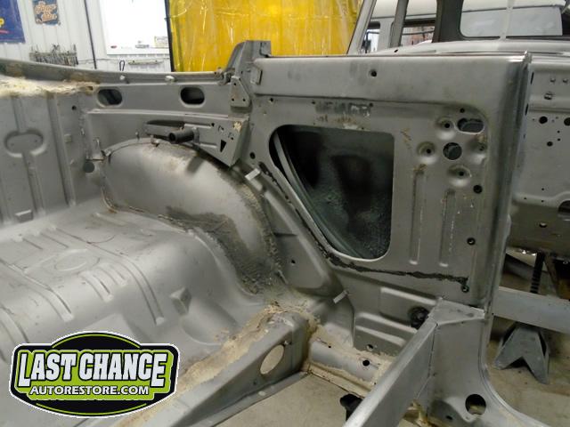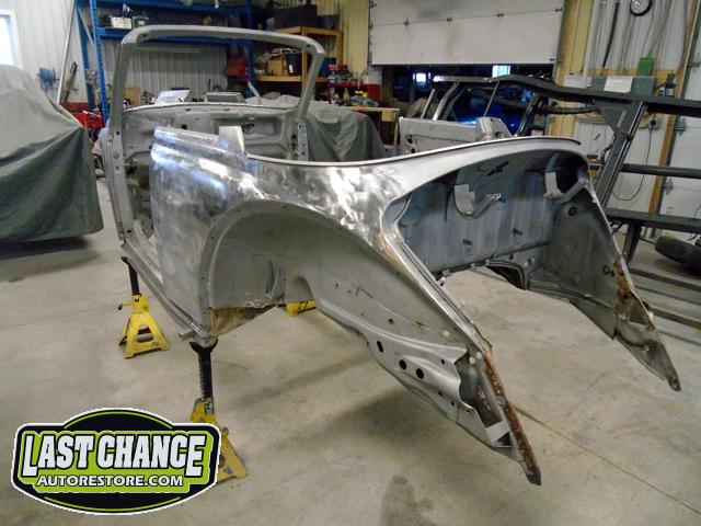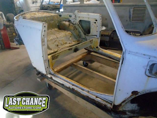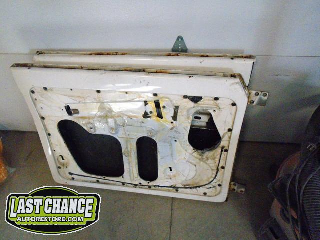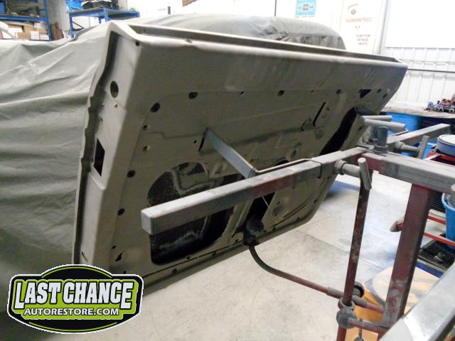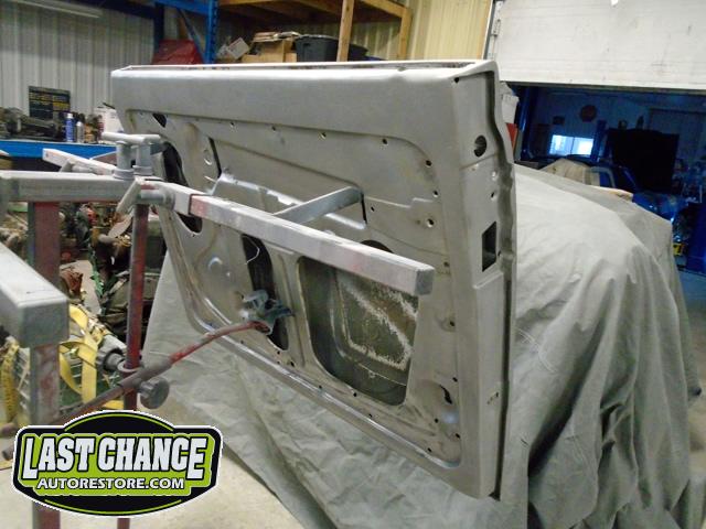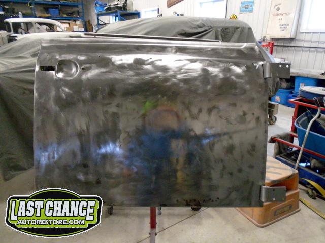 We unbolted both doors from the body and began to prepare the body for media blasting. With the body degreased and wiped down, the complete body was media blasted to bare metal. Both door frames were media blasted and the exterior of both doors were sanded to bare metal.