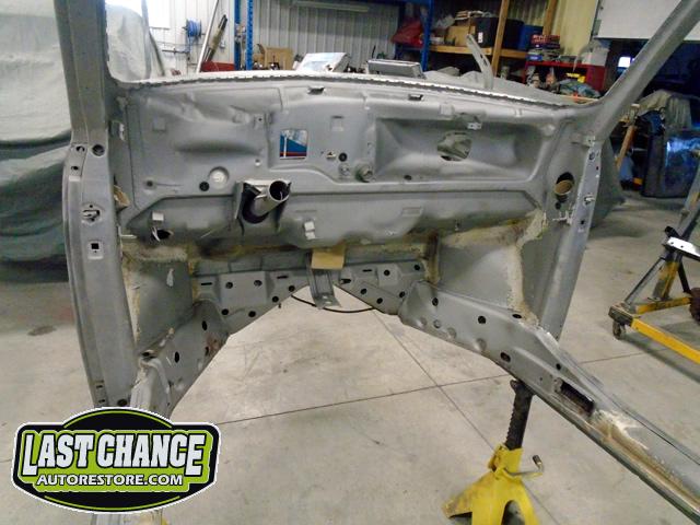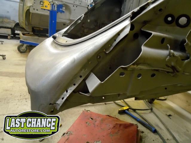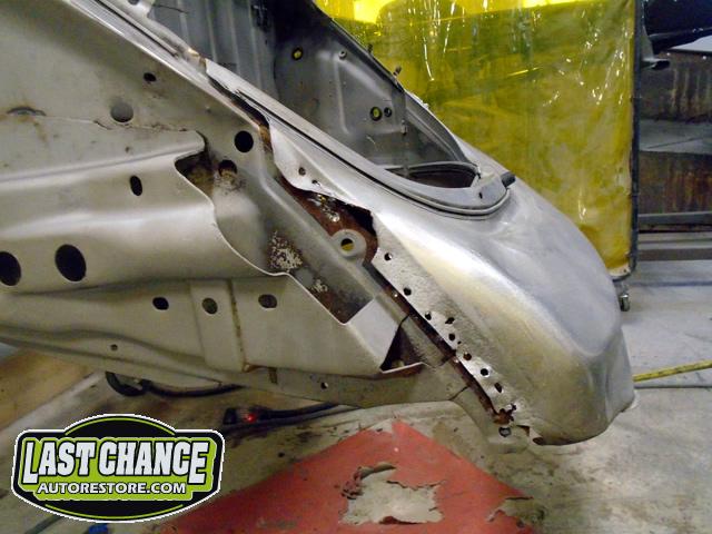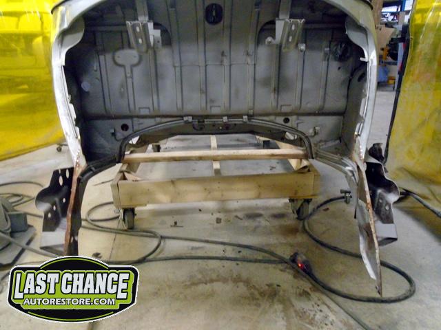 The rusted out rear apron panel (at the rear engine bay opening) was removed from the body after all of the factory spot welds were drilled out. (We will be welding in a new replacement rear apron panel later).