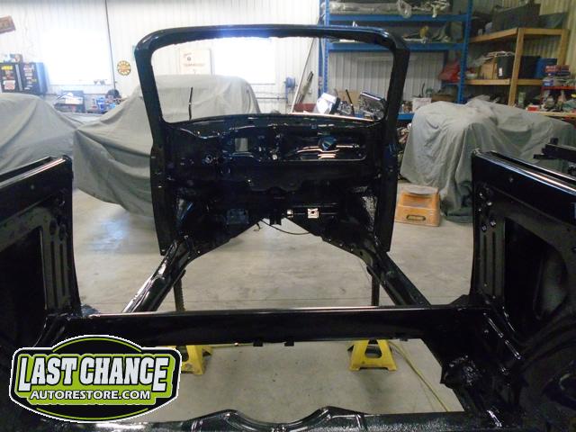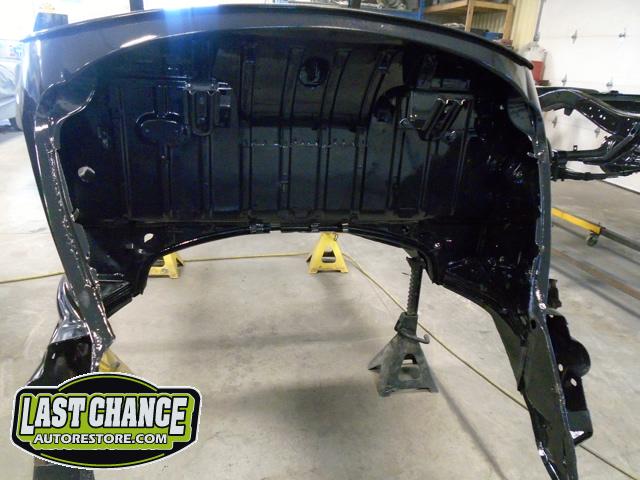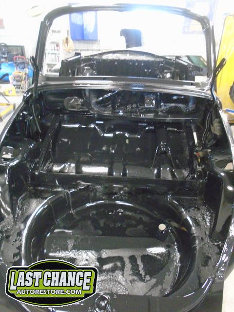 With all of the old factory paint sanded and removed from all areas of the body, it was washed and wiped down with a special degreaser and cleaning solution before the complete body received two coats of a special two part black epoxy metal sealer (to protect the complete car from future rust).