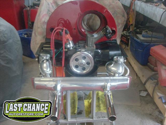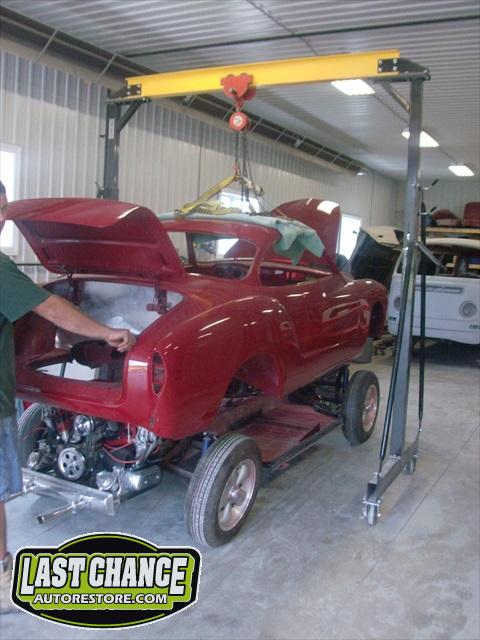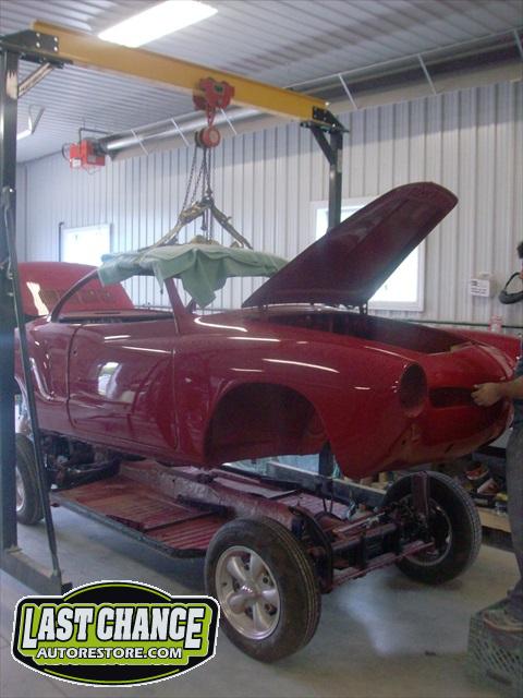 The replacement engine was rebuilt. We made several upgrades along the way. The motor was installed to the transmission/chassis. The next step was to set the body back on the chassis.