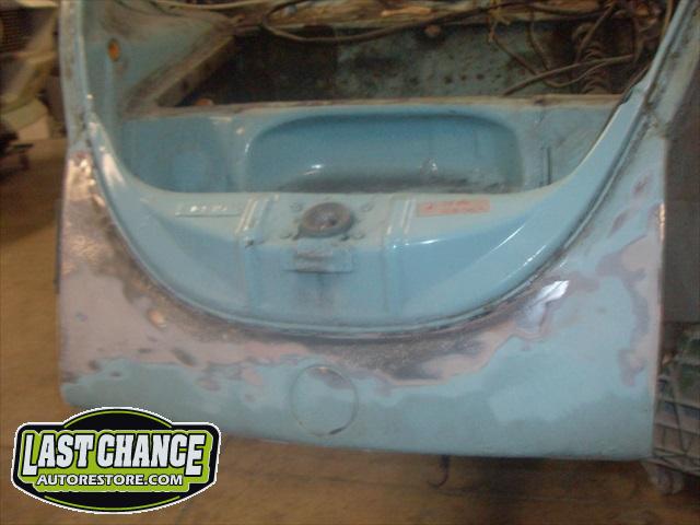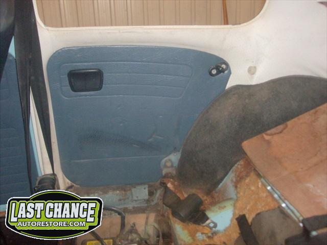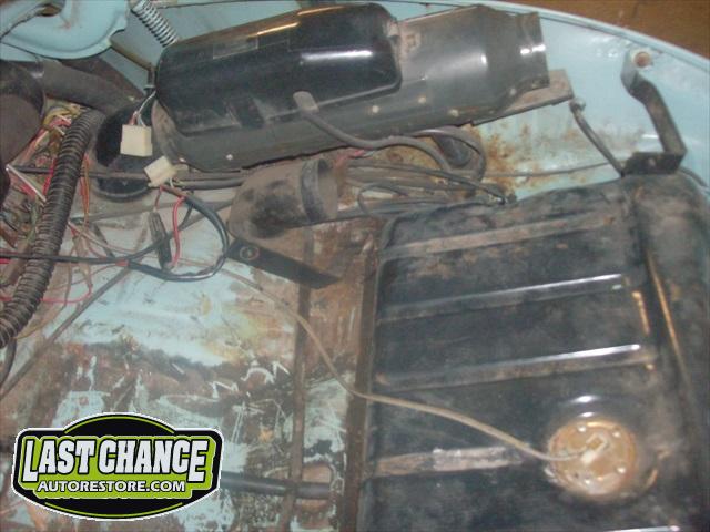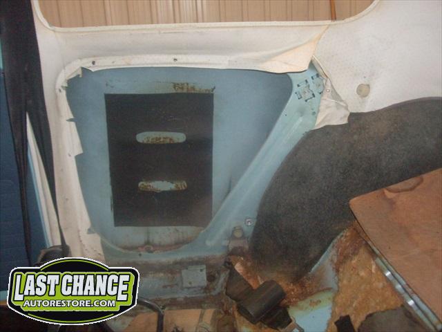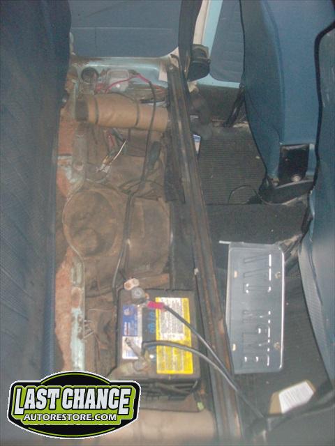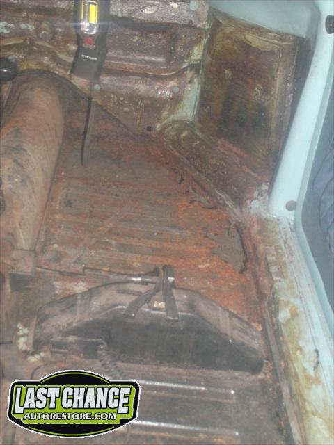 The optional gas heater, spare tire and glass was also removed. The front bucket seats and two piece rear bench seat was also removed. Once the carpet was lifted, we were able to see the excessive rust and rust holes.