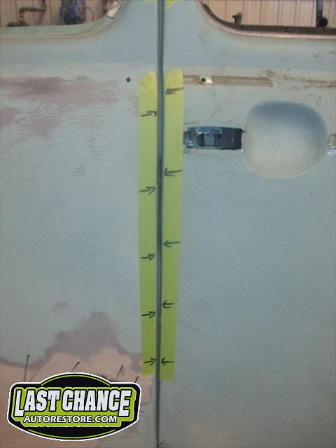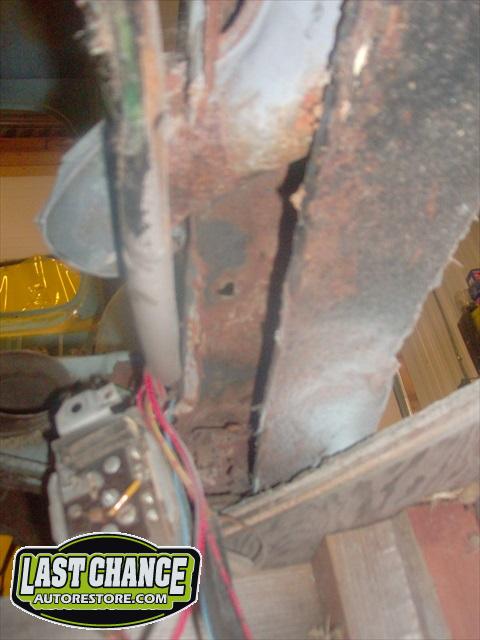 The heater channels down both the driver and passenger sides are badly rusted with very little metal holding the front of the body to the rear section of the body together. The large gaps between both doors and quarter panels (highlighted with green masking tape with black arrows) shows how much the body is pulling away.