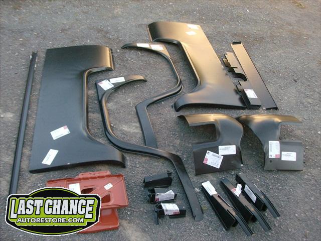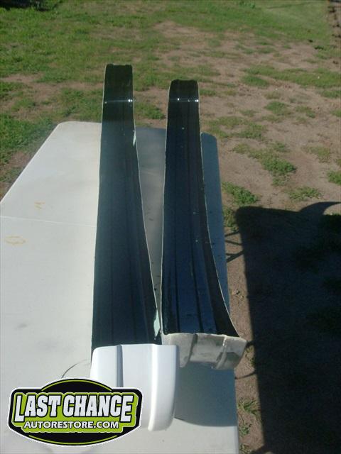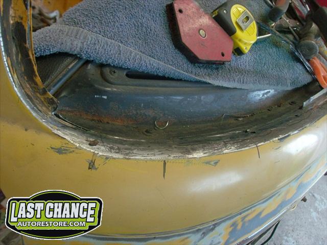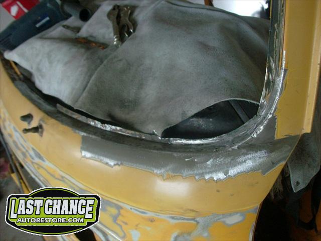 We sanded several layers of paint off the lower exterior panels and viewed excessive use of body fillers used to fill in all of the rust holes. There were also surprises along the way. We found "stick on exhaust foil tape" covering rusted out structural areas and painted over with a brushed on undercoating material.