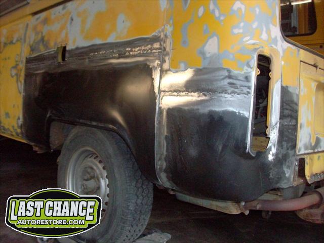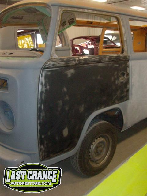 With all of the fabrication complete, we turned our attention to repair the doors. The two front doors received complete door skins, the sliding door was repaired and the rusted out rear tailgate was replaced with an almost rust free one from the Southern U.S.